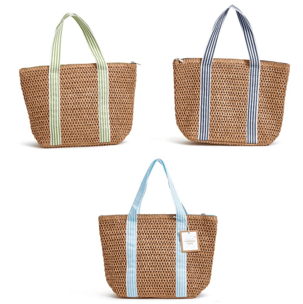 Bolsas Térmicas para el almuerzo hechas a mano con papel rafia y asas de nailon a rayas, incluye cierre de cremallera para mantener los alimentos o bebidas fríos o calientes.