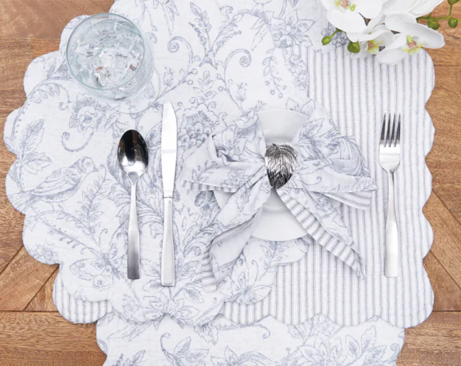Con pájaros cantores caprichosos y otros motivos naturales en una relajante paleta de colores gris y blanco, la colección de manteles Callahan Songbirds es una manera encantadora de estilizar cualquier mesa, incluyendo la servilleta reversible a juego. El encantador patrón floral y de damasco se invierte a un simple patrón de rayas en colores coordinados para más opciones de estilo. ¿Te gusta este aspecto? Callahan Songbirds