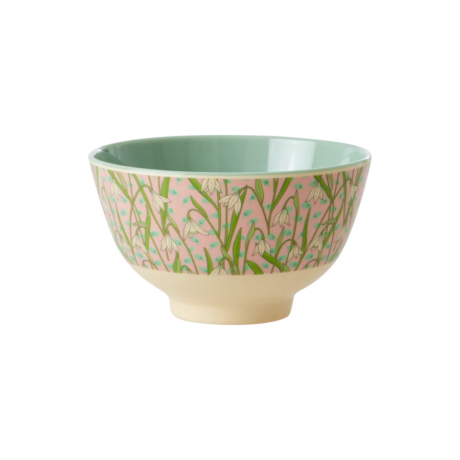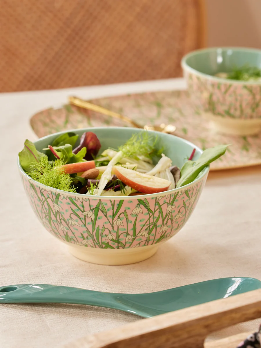Precioso bol de tamaño mediano de melamina, con el bonito estampado llamado New Snowdrop (Nueva Campanilla de Nieve). La melamina es duradera e ideal para el uso diario por su resistencia y fácil limpieza. No absorbe el color ni el sabor de los alimentos - ¡haciendo el bol perfecto para desayunos, sopa, florcitos o para poner caramelos! Ten en cuenta que este producto no es apto para el microondas.