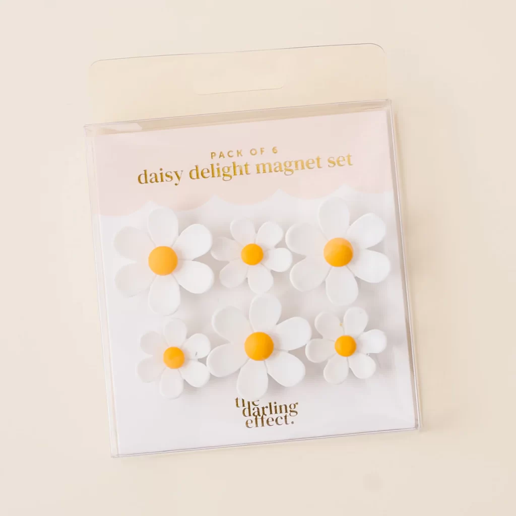 Ilumina tu espacio con nuestro juego de imanes Daisy Delight. Este conjunto de seis imanes vibrantes en dos tamaños es perfecto para añadir un toque de color a tu nevera, taquilla u oficina. Con un agarre fuerte, son ideales para mantener notas, recordatorios y fotos en su lugar. POR QUÉ NOS ENCANTA