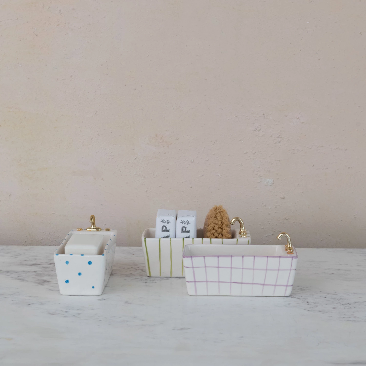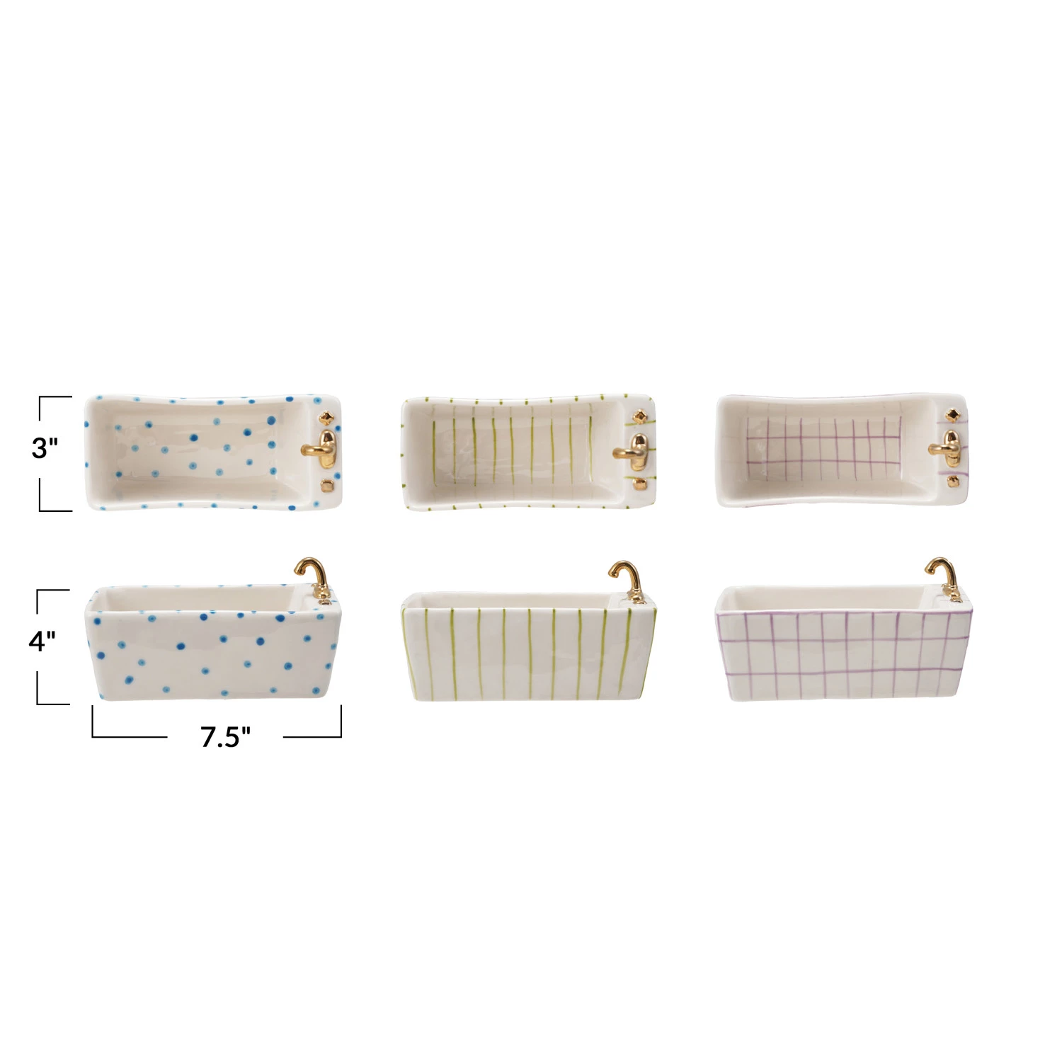 7-1/2"L x 3"An x 4"H Plato de cerámica pintado a mano con forma de bañera con patrón y galvanoplastia dorada, Multicolor, 3 estilos