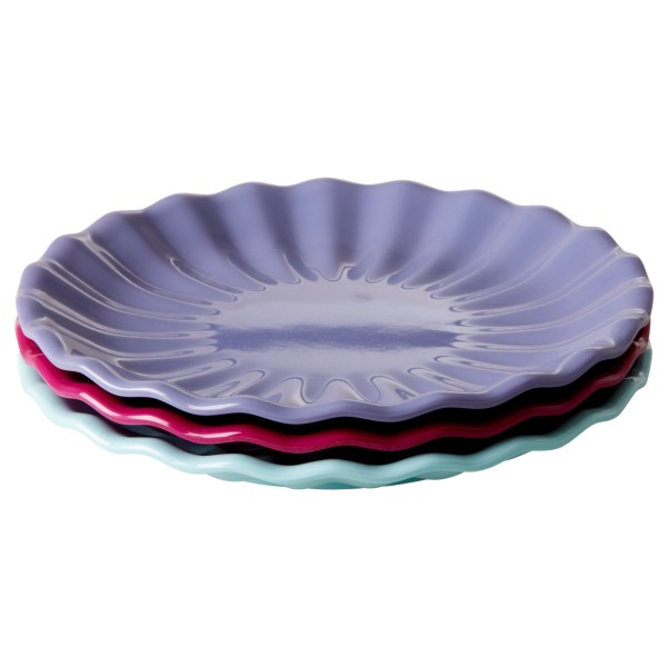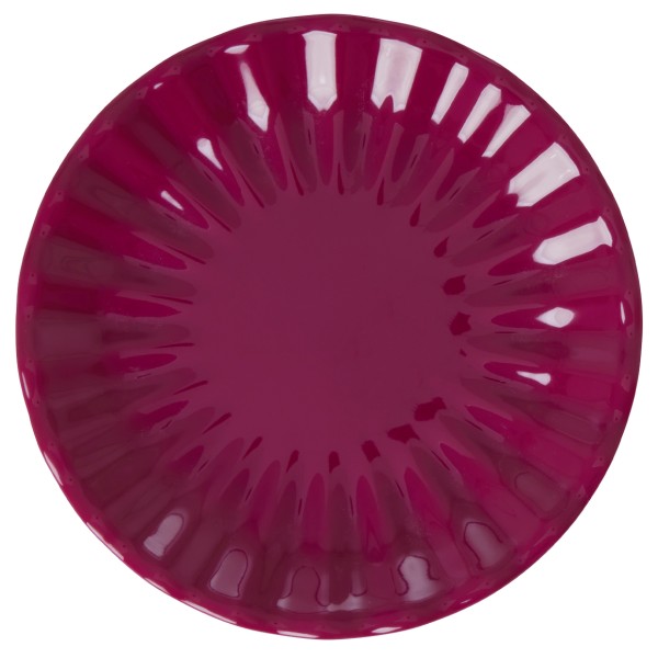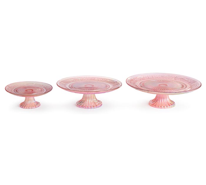 Platos de pastel de vidrio rosa en relieve iridiscentes prensados en tres tamaños.