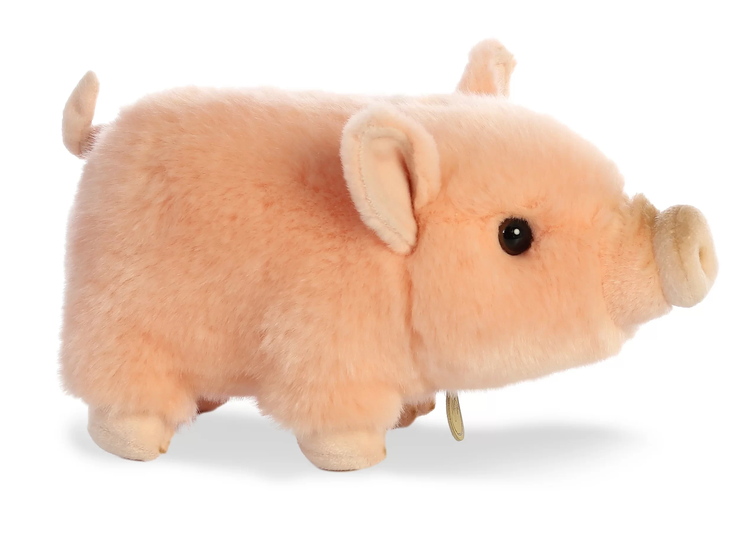Miyoni presenta tus animales favoritos en forma de peluche con un diseño que es simultáneamente realista y adorable. Este cerdito de vientre abultado es completamente rosa y tiene una cola corta.