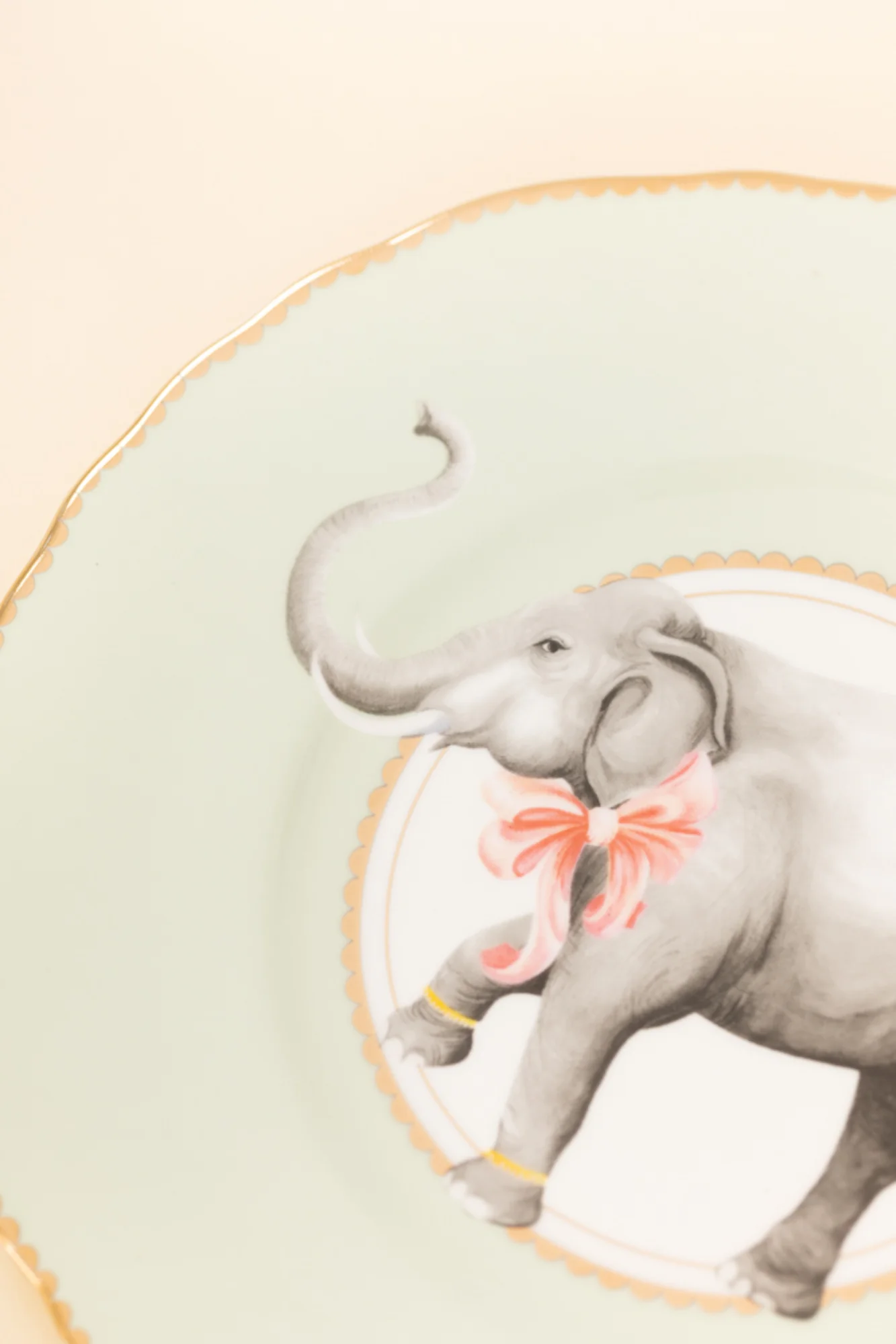 ¿No es tan mono este plato de elefante? ¡Un nuevo espectáculo para añadir a tu mesa! Mi preciosa ilustración de elefante está orgullosa en este plato de sándwiches de estilo vintage. El fondo menta pálido y el detalle dorado en lámina hacen que este plato sea perfecto para decorar tu próxima mesa de té de la tarde. ¡Totalmente con estilo!