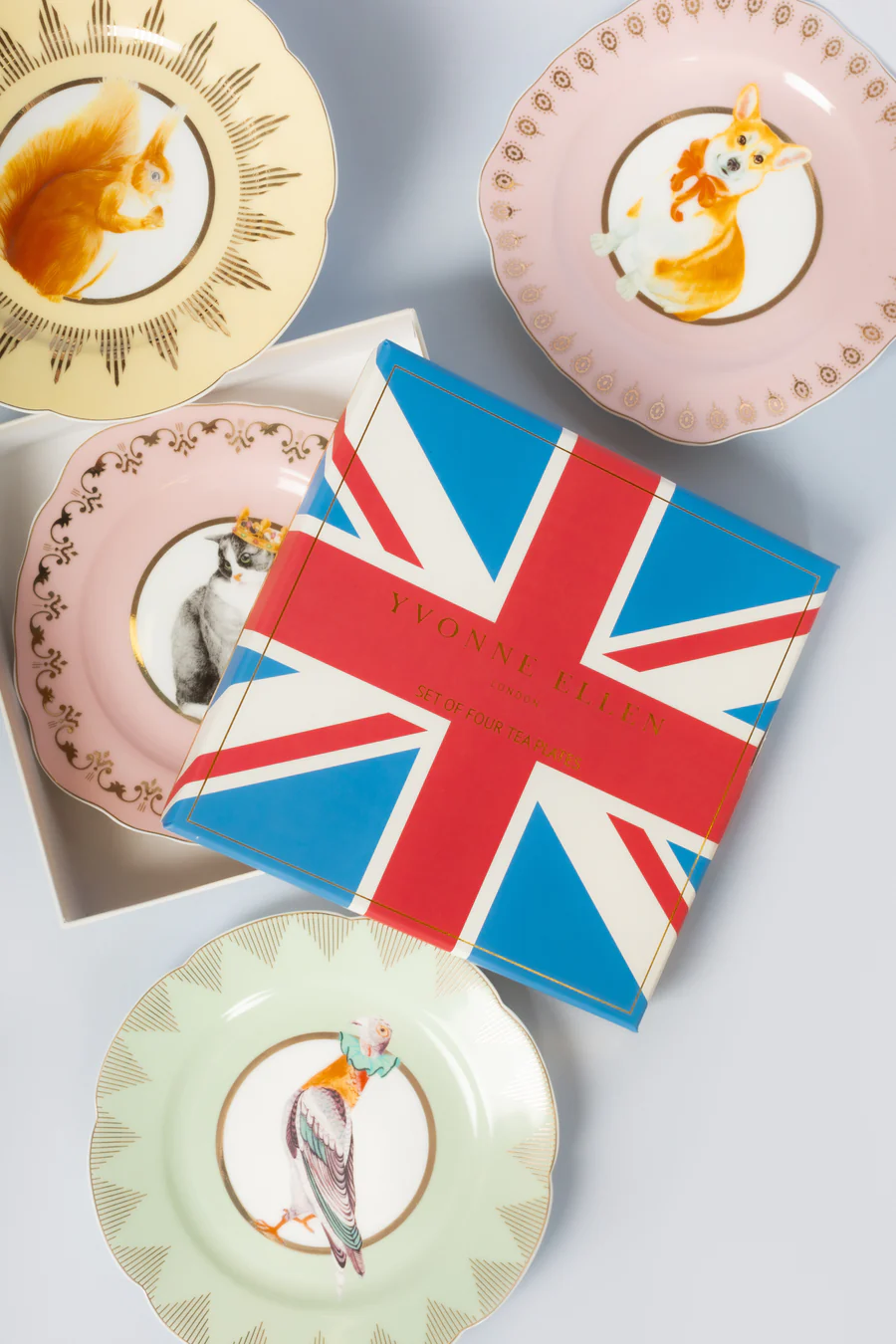Déjate llevar por el encanto de Inglaterra con nuestra nueva gama "Lo Mejor de British". Animales ingleses clásicos se encuentran con detalles dorados vintage y reales sobre vajilla encantadora. Desde cisnes en tazas de té hasta palomas en platos, cada pieza cuenta una historia caprichosa. Los platos de té en pastel están adornados con cuatro de mis nuevos animales británicos (Corgi/Ardilla/Paloma/Gato) decorados con accesorios adorables.