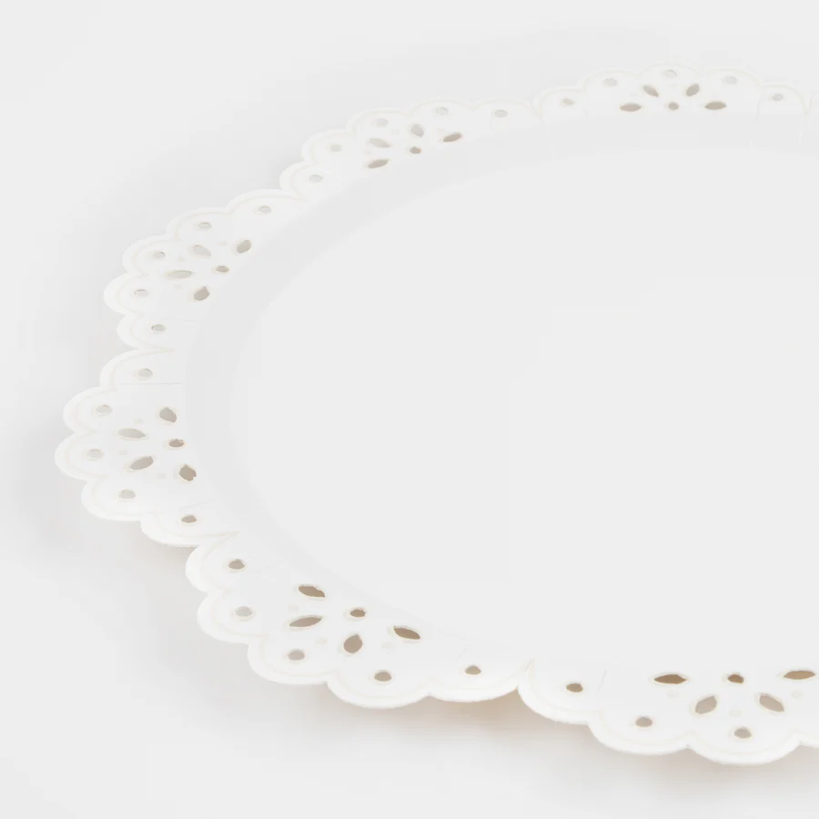 Este bonito conjunto de fiesta está inspirado en el bordado inglés, un delicado diseño de encaje que ha vuelto a estar de moda. Estos grandes platos blancos son ideales para capas de mesa y también se pueden utilizar como platos de servir. Son perfectos para despedidas de soltera, baby showers o cualquier celebración en la que desees un aspecto elegante y refinado.