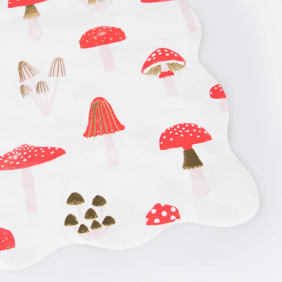 Los champiñones siguen teniendo su momento y lucen mágicos como un diseño de servilleta festiva. Su rojo y blanco encajan perfectamente en el tema de color festivo tradicional, con toques modernos de elegante papel dorado y rosa para un efecto adicional. Estas grandes servilletas, con un borde ondulado elegante, son ideales para cualquier comida navideña y se verán brillantes y hermosas en la mesa de la fiesta.