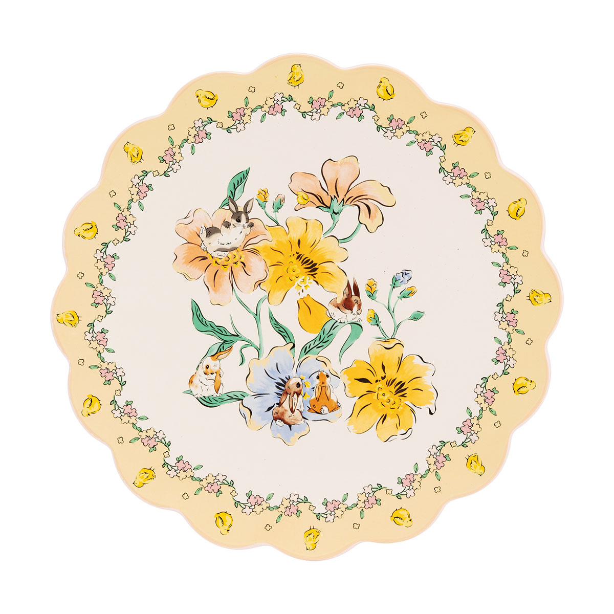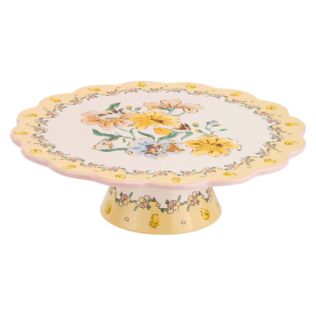 Elaborado con cerámica duradera, el stand presenta intrincadas obras de arte animal y floral inspiradas en ilustraciones vintage y la primavera campestre. Los dulces conejos se combinan con delicados detalles florales sobre un fondo blanco nítido, mientras que el borde amarillo soleado está adornado con adorables pollitos y separados por una cadena de flores suaves en tonos pastel. La base con patas continúa el motivo amarillo de pollito y flor, creando un aspecto bellamente coordinado de arriba a abajo. El diseño elevado pone a tus pasteles en el centro de atención, mientras que el borde suavemente gratinado añade un toque de carácter tradicional, sinónimo del estilo atemporal de Cath Kidston.