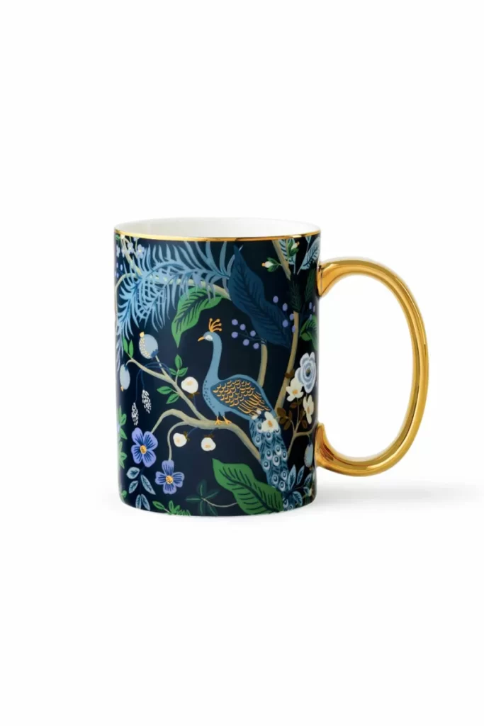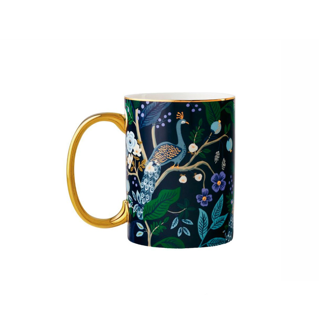 Magníficos pavos reales se posan sobre ramas retorcidas en nuestra taza de pavo real, con acentos dorados que brillan contra un profundo azul medianoche. Nuestras tazas de porcelana cuentan con diseños ilustrados y un borde y un asa dorados para añadir un toque especial a tu bebida favorita.