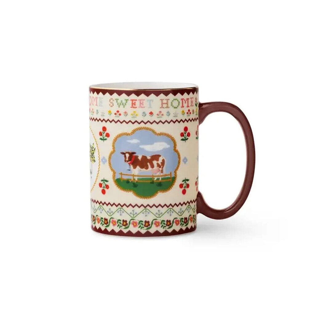 Ilustraciones populares inspiradas en la granja, detalles estilo punto de cruz y un mango y borde burdeos hacen de esta encantadora taza una favorita de todos los días.