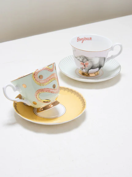 Disfrute de una divertida y encantadora gama de vajillas de estilo vintage de la diseñadora británica Yvonne Ellen, conocida por sus extravagantes diseños, hechas de porcelana china de alta calidad, con hermosos colores contrastantes y adornos chapados en pan de oro, lo que le da a cada producto un estilo individual.