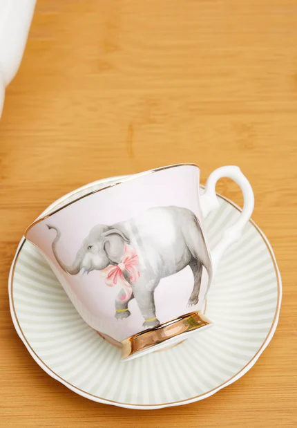Esta hermosa taza de té y platillo presenta un adorable elefante en rosa empolvado con un suave platillo de color menta terminado con detalles de borde dorado y asas estriadas de estilo vintage, perfecto para fiestas de té.